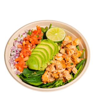 Spinach & Arugula, Mediterranean Chicken Thigh, Sliced Avocado, Guacamole, Balsamic Tomatoes, Red Onions, Cilantro, Lime & Vale Verde Ranch.