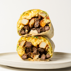 Eggs scramble, Steak tenderloin tips, Cheddar cheese, Roasted potatoes, guacamole, Chipotle Ranch Sauce