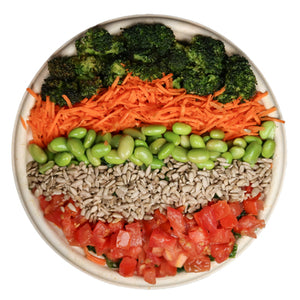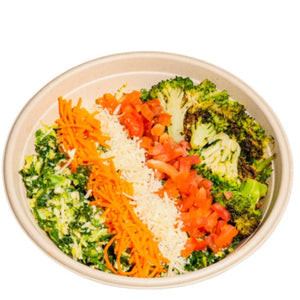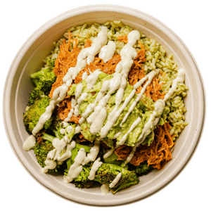 **Salmon available as an add-on** Lemon Garlic Kale, Spinach & Arugula, Edamame, Carrots, Broccoli, Tomatoes, Sesame Seeds, Sunflower Seeds, Scallions, Cilantro, Lime & Greek Yogurt Ginger Dressing.
