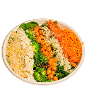 Shredded Lemon Garlic Kale, Spinach & Arugula, Veggie Quinoa, Buffalo Chickpeas, Raw Carrots, Broccoli, Tomatoes, Almonds, Hemp Seeds & Vale Vinaigrette
