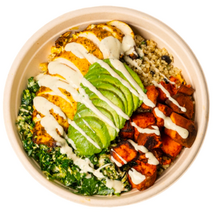 Lemon Garlicl Kale, Veggie Quinoa, Roasted Sweet Potatoes, Lemon Garlic Chicken Breast, Sliced Avocado, Vale Verde Sauce