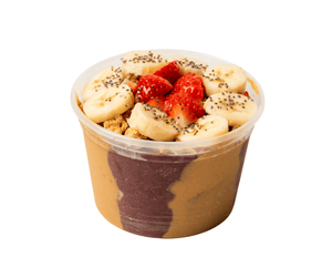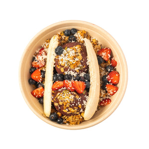 2 scoops of açaí between a split banana, your choice of granola, and 3 toppings. Organic and certified fair trade Açaí.