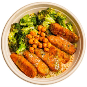 Veggie Quinoa, Roasted Broccoli, Buffalo Vegan Tenders, Buffalo Chickpeas, and a side of Vale Vinaigrette.