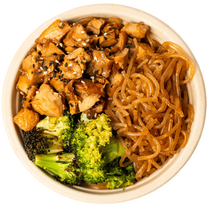 Sweet Potato Noodles, Roasted Broccoli, Teriyaki Chicken, and a side of Curry Honey Mustard. (Gluten Free)